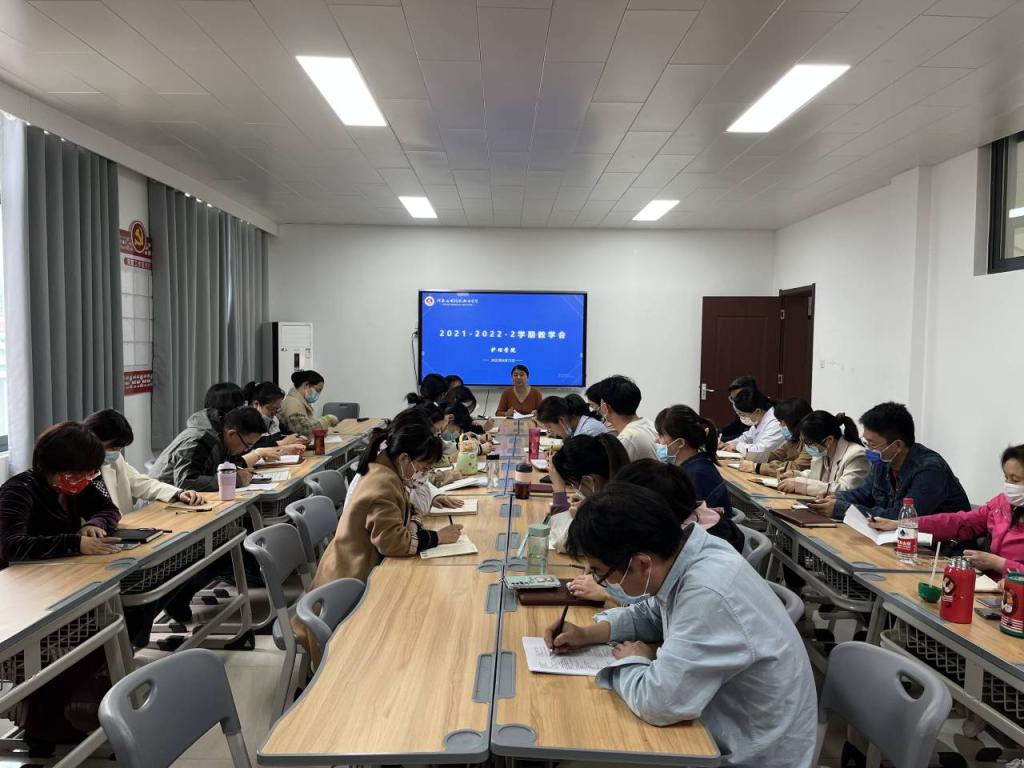 2022年4月12日下午,护理学院全体教师在A515召开教学工作会议,集中学习《河南省职业教育与成人教育2022年工作要点》以及夏季疫情防控要点,同时学习了《以德立身,以德施教,不断提高师德修养和育人质量》师德主题教育讲座。