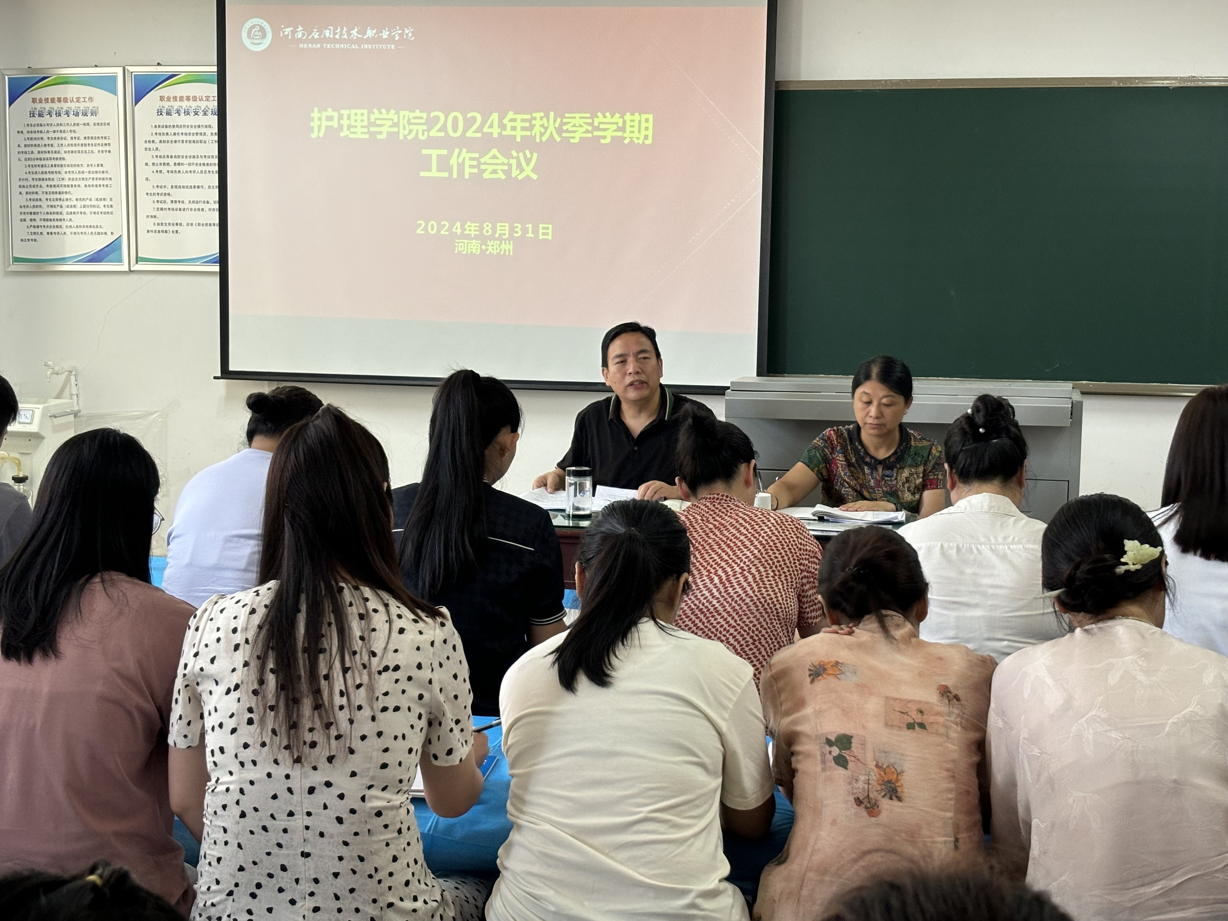 为了确保新学期各项工作的顺利开展,8月31日,护理学院组织全体教职工在D306召开新学期工作会议。护理学院党总支书记杨明杰主持会议,并认真详实传达了学校党委书记闫俊山和校长薄新党在全校新学期工作会议上的讲话精神,总结过去的成绩,分析当前的发展形势,规划新学期的各项工作。本次会议从党建、教学、学生工作、就业、产教融合、“双高”建设、安全稳定等多个方面展开,通过明确工作目标、细化工作措施、强化责任落实,护理学院将在新学期以更加饱满的热情、更加务实的作风,推动学院各项工作再上新台阶。