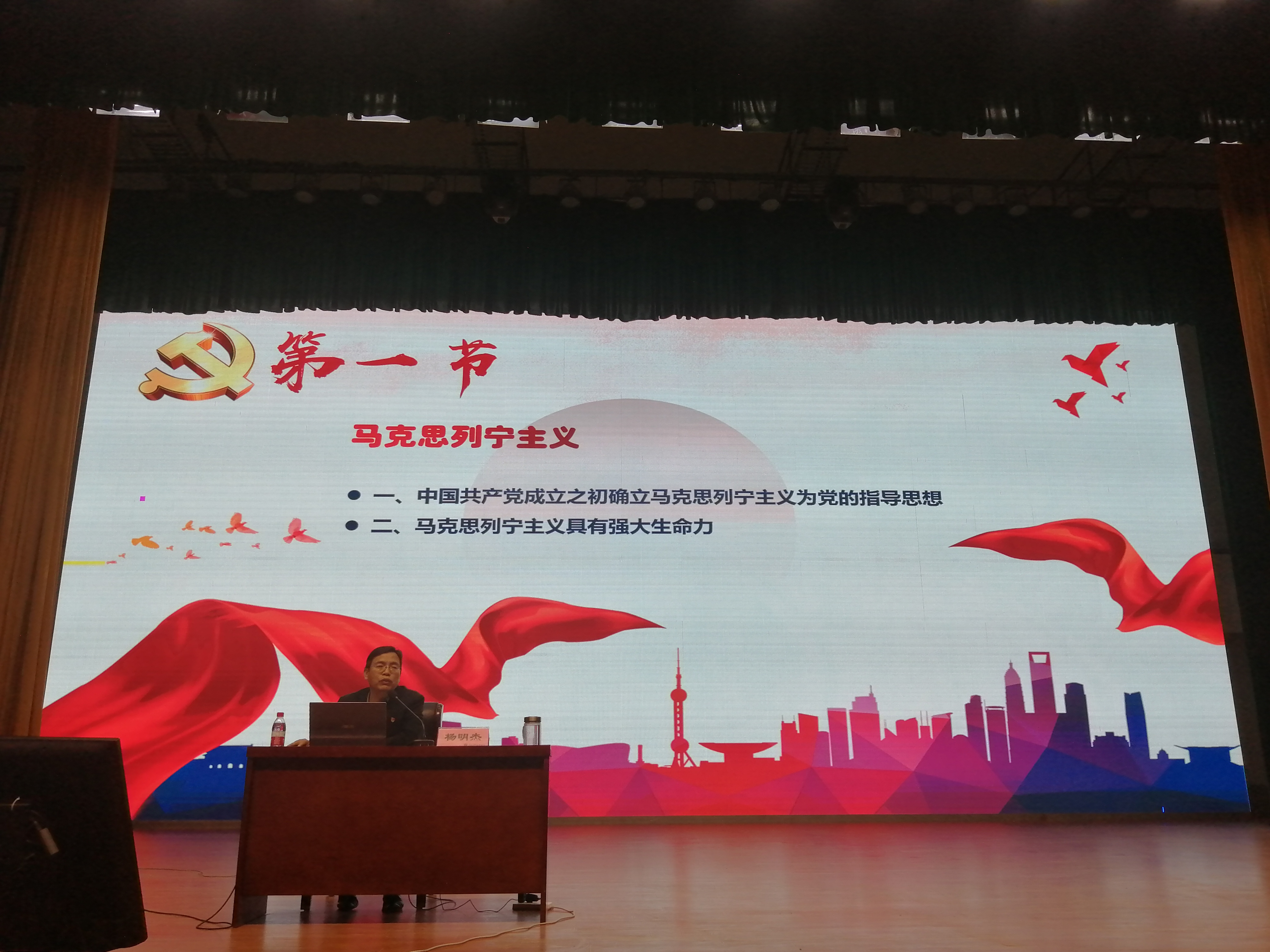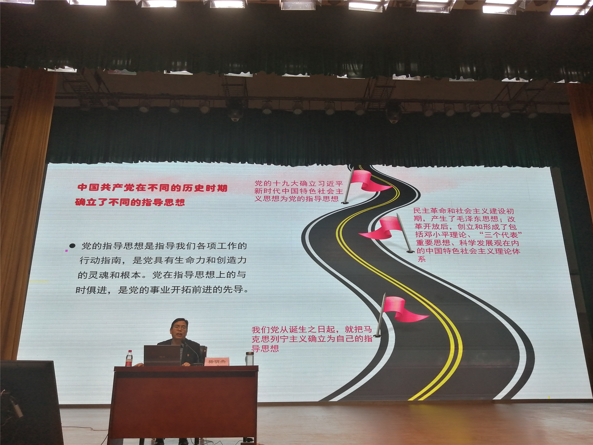 党的指导思想是指导我们各项工作的行动指南,是党具有生命力和创造力的灵魂和根本。随着社会主义实践的不断深入和理论的不断创新,党的指导思想也在不断丰富发展。在党课上,杨明杰书记充满激情地讲解了党成立之初,就将马克思列宁主义作为全党的指导思想,并将马克思列宁主义与中国革命和建设的实践相结合,在不同的历史时期产生了毛泽东思想、邓小平理论、“三个代表”重要思想、科学发展观、习近平新时代中国特色社会主义思想。并且详细介绍了各个思想理论形成的历史过程、主要内容、核心问题和重大意义。