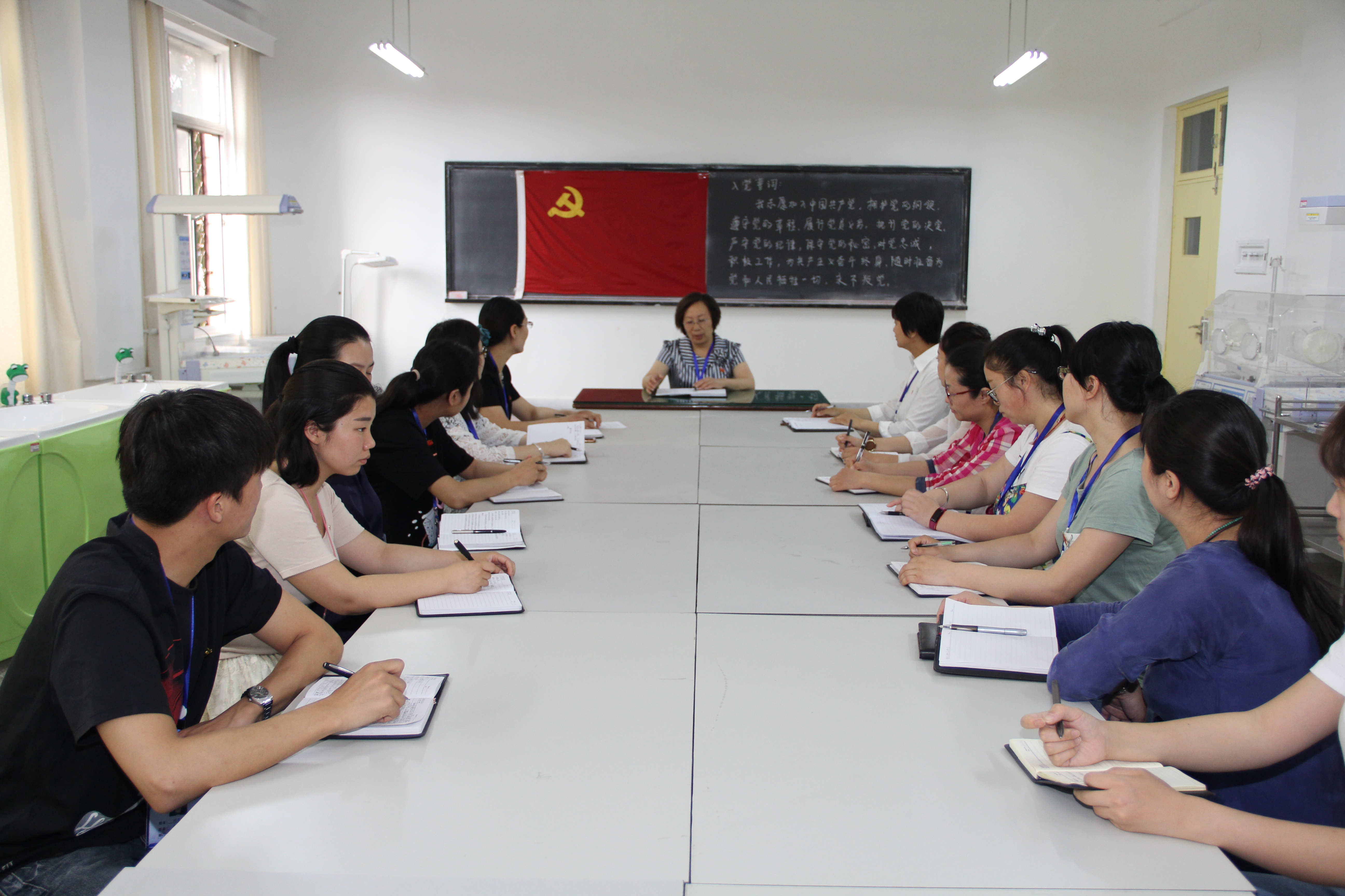 郭改英书记对护理学院提出三点要求:一是佩戴党员徽章上岗,增强党员意识。时刻以党员的标准要求自己,努力提升修养和专业能力建设,强化党员担当意识,突破专业建设难题;二是公开党员身份,接受群众监督。建立健全多渠道监督平台,深入教职工和学生内部,倾听师生,融入师生,服务师生。三是开展创先争优,树立良好形象。重视团队建设,积极发挥党员同志的模范带头作用,争取建成学校的模范支部。