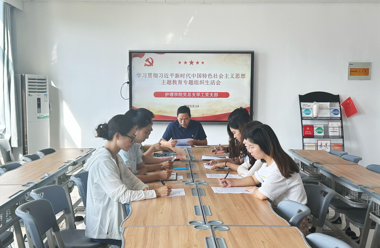 根据《中共bat365在线中国官网登录入口委员会关于召开学习贯彻习近平新时代中国特色社会主义思想主题教育专题组织生活会》的通知要求,2023年9月14日上午,护理学院党总支学工党支部组织全体党员在A515召开主题教育专题组织生活会,会议由党支部书记杨明杰主持。