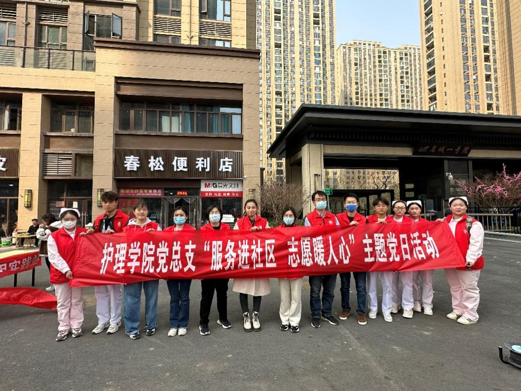 2024年3月14日,护理学院党员教师和学生志愿者走进郑州市高新区紫檀社区,开展义诊服务,将专业的医疗知识和服务送到社区居民身边,解决居民日常生活中遇到的健康问题。