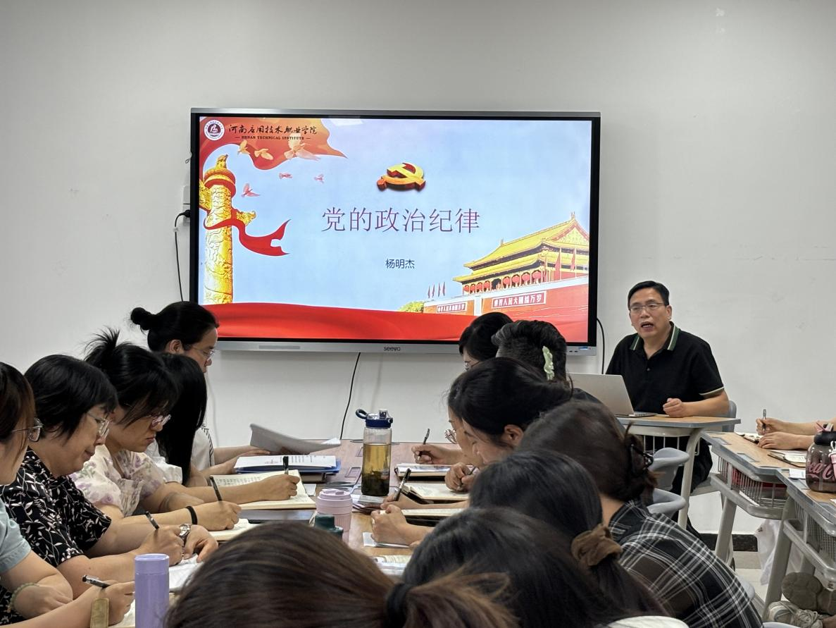 根据学院有关工作安排,2024年5月28日,护理学院党总支书记杨明杰以《党的政治纪律》为题在A515党员活动室为护理学院全体教职工讲授专题党课。