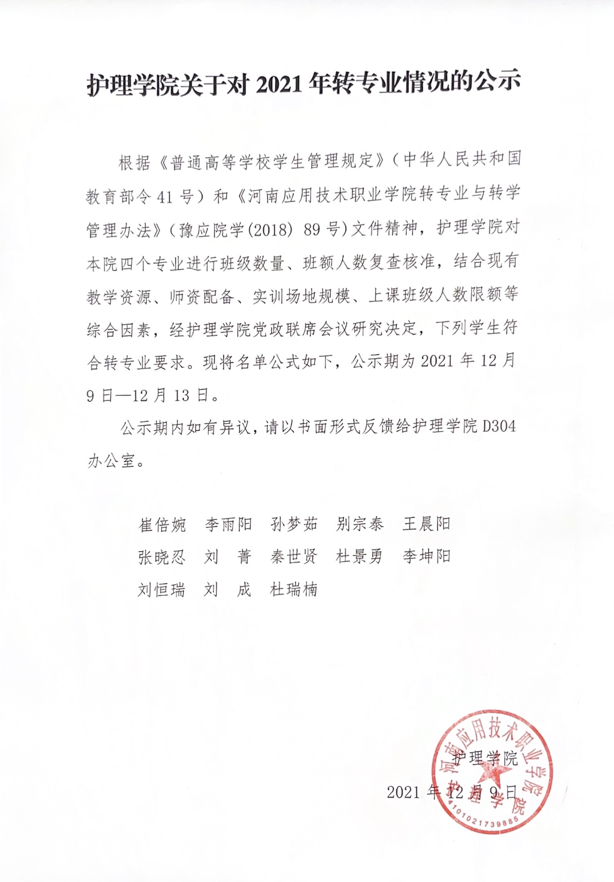 护理学院关于对2021年转专业情况的公示