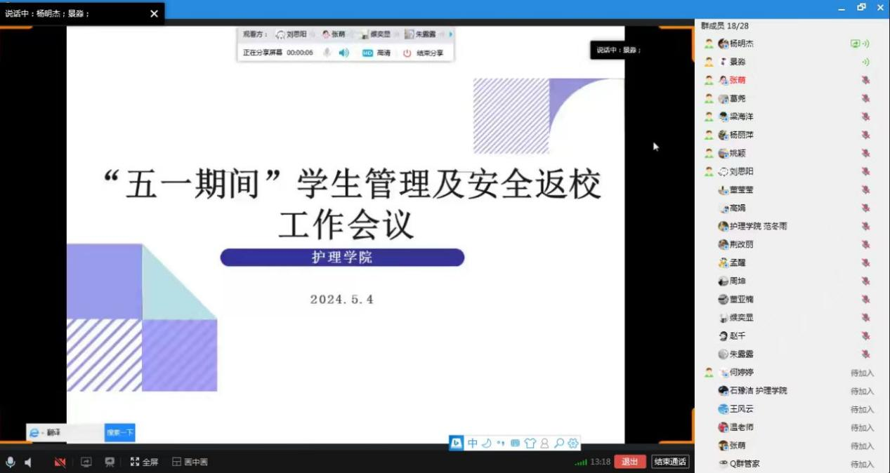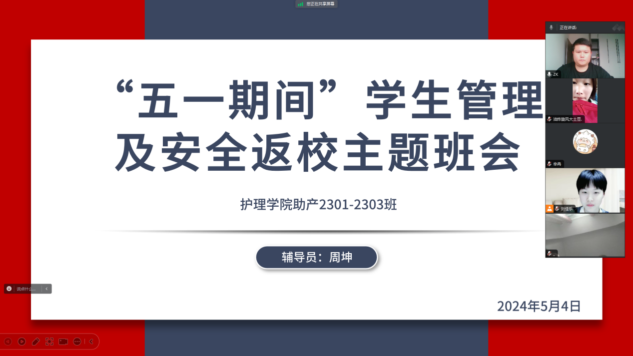 5月4日,各班通过线上视频方式召开主题班会。班会重点强调了假期期间的人身安全、交通安全、财产安全、用电安全、饮食安全、网络安全、返校安全等问题,引导大家增强安全意识,同时通过案例讲解等方式,为学生普及了各类安全知识,促进学生了解并掌握基本的安全技能。