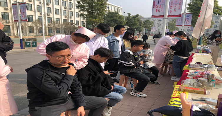 本次特色职业教育活动包含耳穴压豆体验、养生八段锦展示、刮痧、拔火罐、艾灸的操作、讲解等,以上传统中医技术,简便易行、行之有效。护理学院专业的同学们在中医窦纪梁老师指导下提前准备、认真练习、严格操作,吸引全校众多师生参与其中,切身体验后,纷纷赞不绝口。