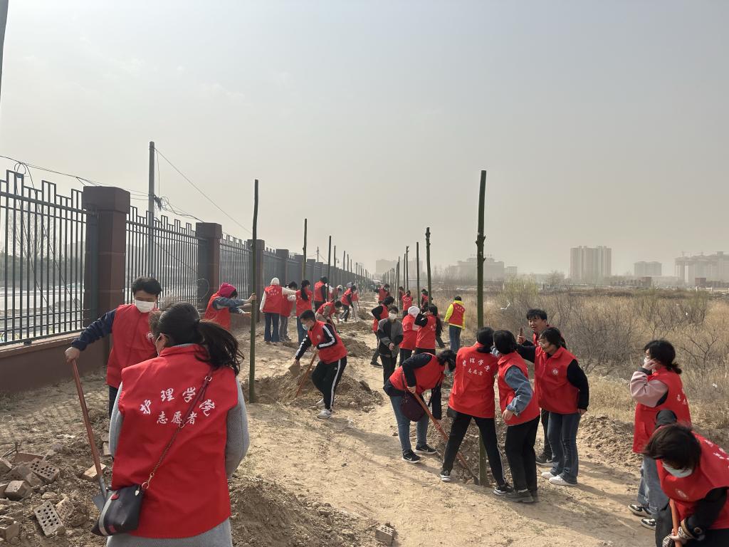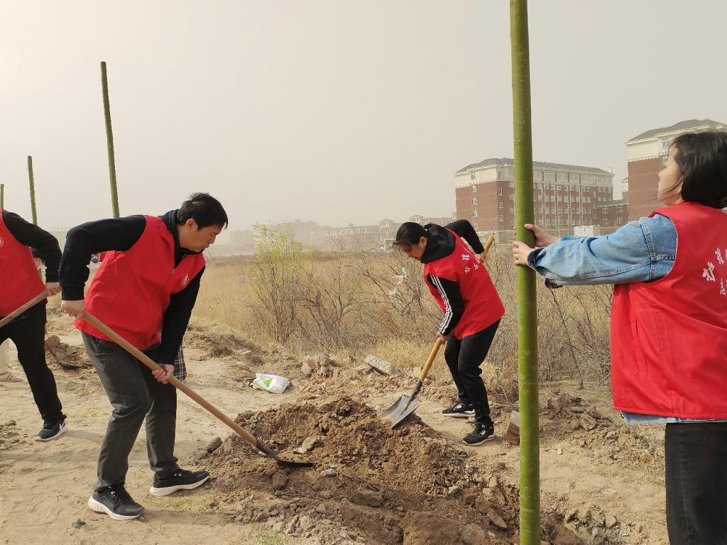 2023年3月11日上午8点,在学院领导的带领下,大家乘车到达新校区后,不顾旅途的劳累,顶着巨大的风沙,兴致盎然奔走在各处植树区域。大家分工明确,各司其职,入坑栽种,填充土壤,浇水定根,合计完成植树十九棵。
