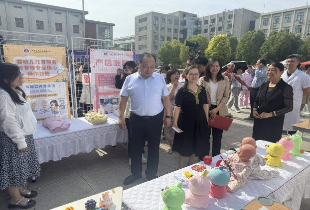 助产专业以“关爱母婴健康”为核心,展示了产后康复仪的操作流程。通过仪器演示与理论讲解,传递科学育婴理念。而婴幼儿托育服务与管理专业的展台则温情满满,学生用柔软的手法为模型婴儿进行抚触操作,婴幼儿手工制作,吸引师生们频频拍照记录。
