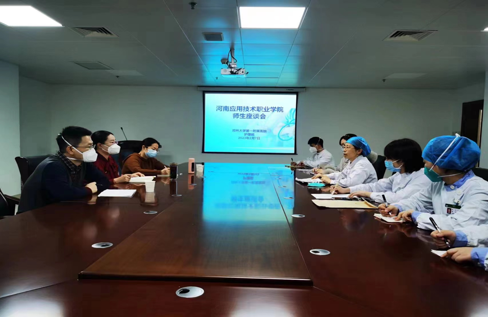 为更好了解bat365官网护理岗位实习情况,拓宽就业渠道,挖掘校企合作新潜力,护理学院于2023年2月28日上午到郑州大学第一附属医院河医院区参加bat365官网实习生线下座谈会,本次会议由护理学院温晓丽副院长、刘常鹏老师、柳超老师与郑大一附院总代教徐宏蕊老师、朱雪雅老师、韩郁壬老师、胡晓静老师参加,bat365官网郑大一附院全体实习生参加。