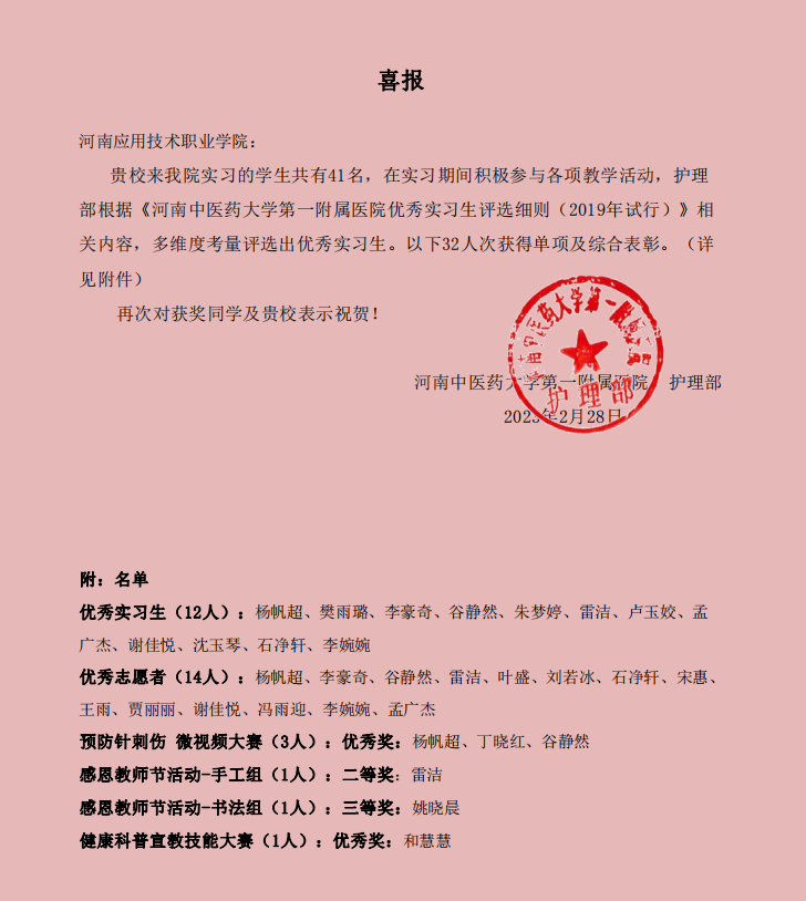 春风放暖,迎春送喜。2023年3月3日,河南中医药大学第一附属医院在人民路院区门诊楼15楼会议室隆重举办教学基地中后期考核暨2022-2023年度实习生表彰大会,护理学院王风云院长与刘常鹏老师应邀参加了会议。