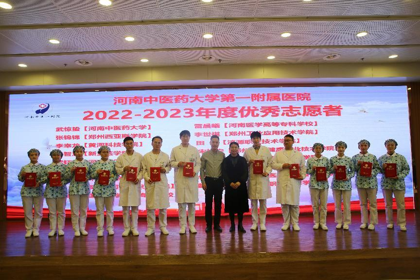 河南中医药大学第一附属医院王海峰院长作为东道主充分肯定了2022年的实习教学工作,表彰了一年来在各实习岗位学习能力突出的优秀实习生和疫情期间表现优异的实习生。