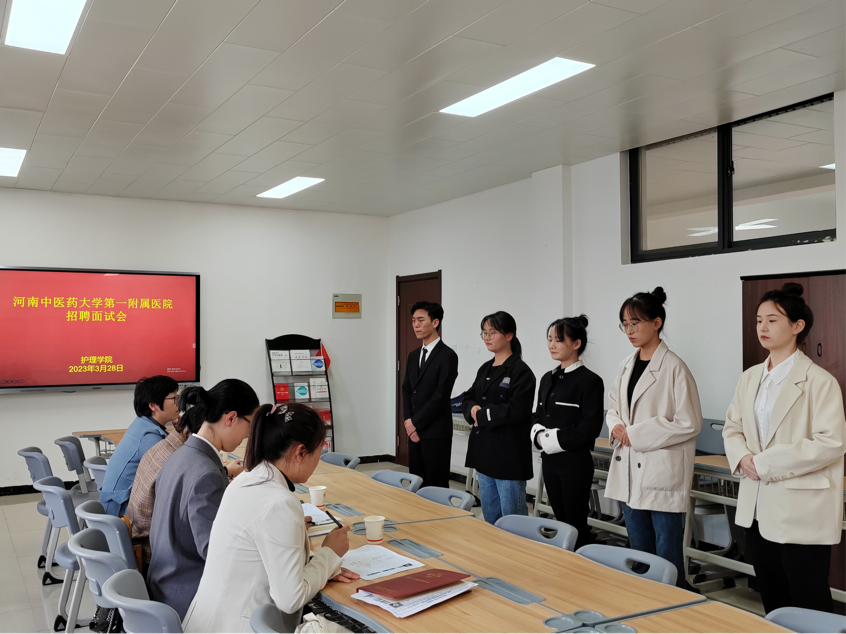河南中医药大学第一附属医院护理部罗慧敏老师借助视频为同学们介绍医院的基本情况、护理教学管理概况及实习就业要求和准则。讲座结束后,在行政楼515进行招聘面试。面试中,我院学生镇定自如,自信稳重,凭借扎实的理论知识和良好的临床技能,得到面试老师的充分认可。